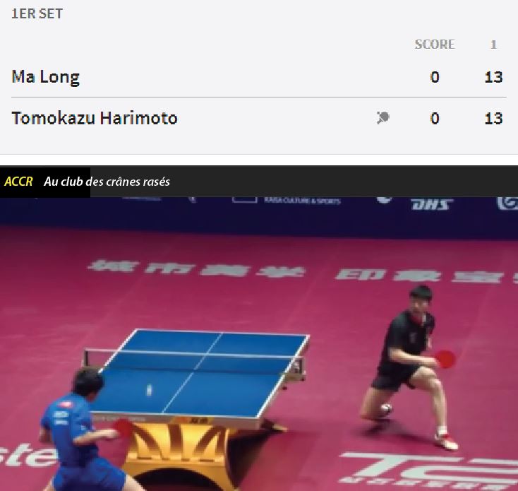 Poto Warsaw76 ex champion de France et de Calabre de tennis de table, devrait suivre la partie qui se joue actuellement entre Le crack Ma Long :suspect: et la valeur montante de ce sport le très jeune Tomokazu Harimoto : 1er set très serré alors que le double olympique est donné archi favori.
