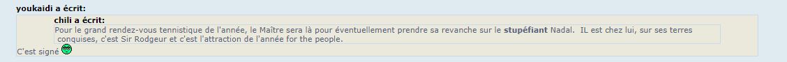 Arrête ta déconne l'arsouille, on sait tous ici, que derrière ce nadalhater que tu cherches à nous montrer, se cache LE plus grand fan de Rafa de ce fofo à la con. :capello: