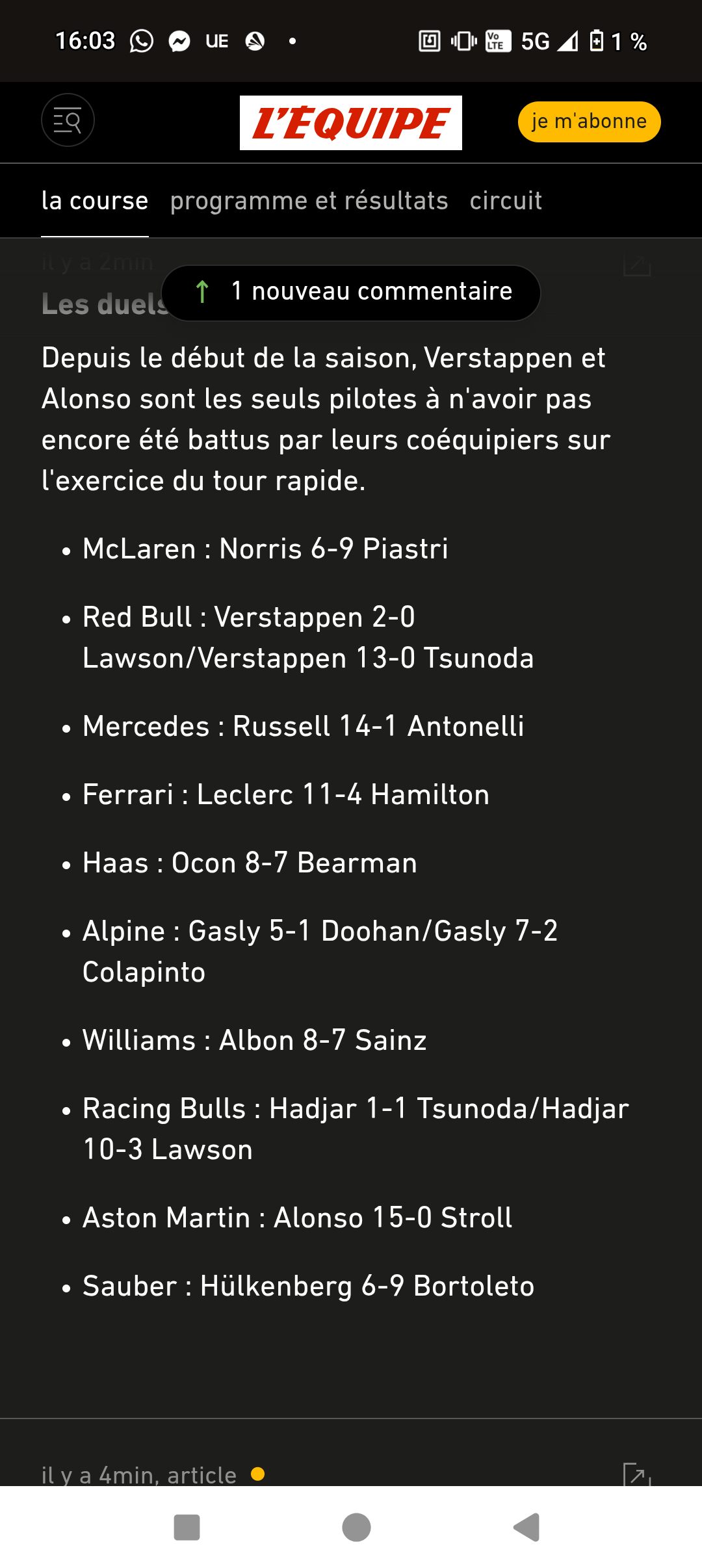 Maintenant on verra sur une nouvelle base en 2026, si Hadjar est promu, est-ce qu'il peut se hisser à un niveau correct ? Son gros point fort si ça devait arriver, c'est son intelligence et ses aptitudes techniques, qui devraient lui permettre de mieux s'en sortir que Tsunoda (dont l'anglais très moyen ne doit pas aider avec les ingénieurs). D'après les interviews que j'ai entendues d'Hadjar, son surnom de mini Prost ne sort pas de nulle part, il est extrêmement pointu dans ses explications sur le comportement d'une monoplace, donc il aura de meilleures chances en partant d'une feuille blanche.